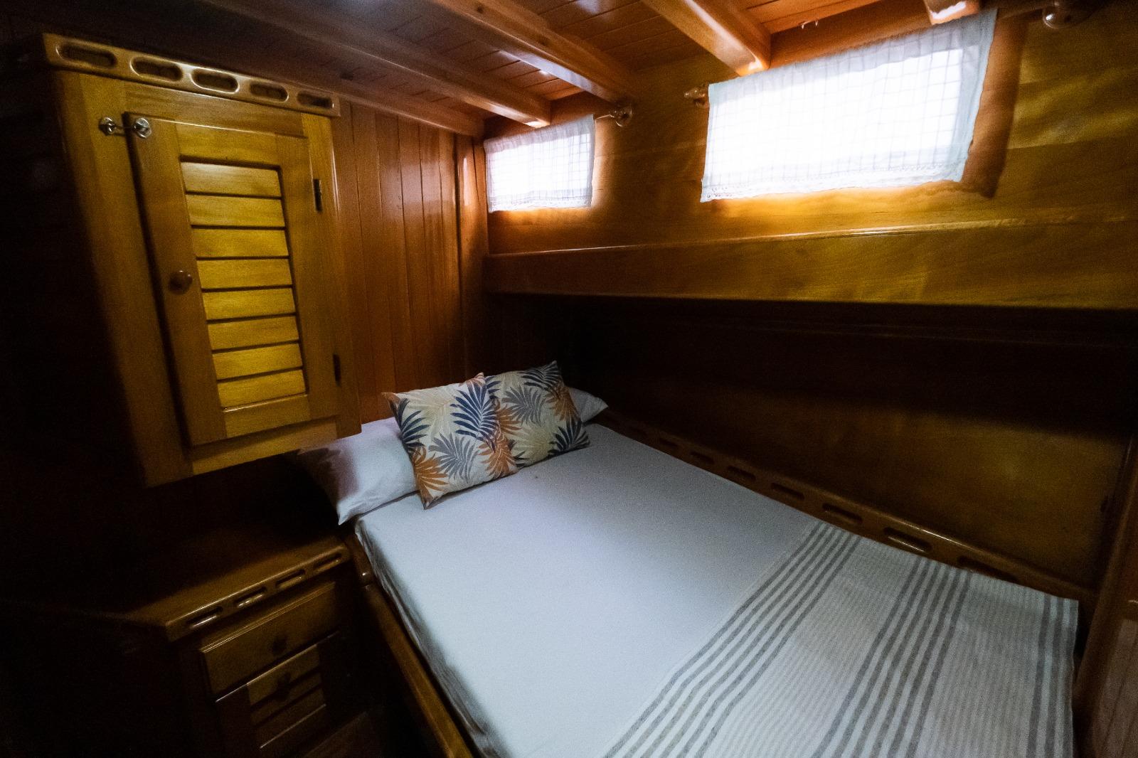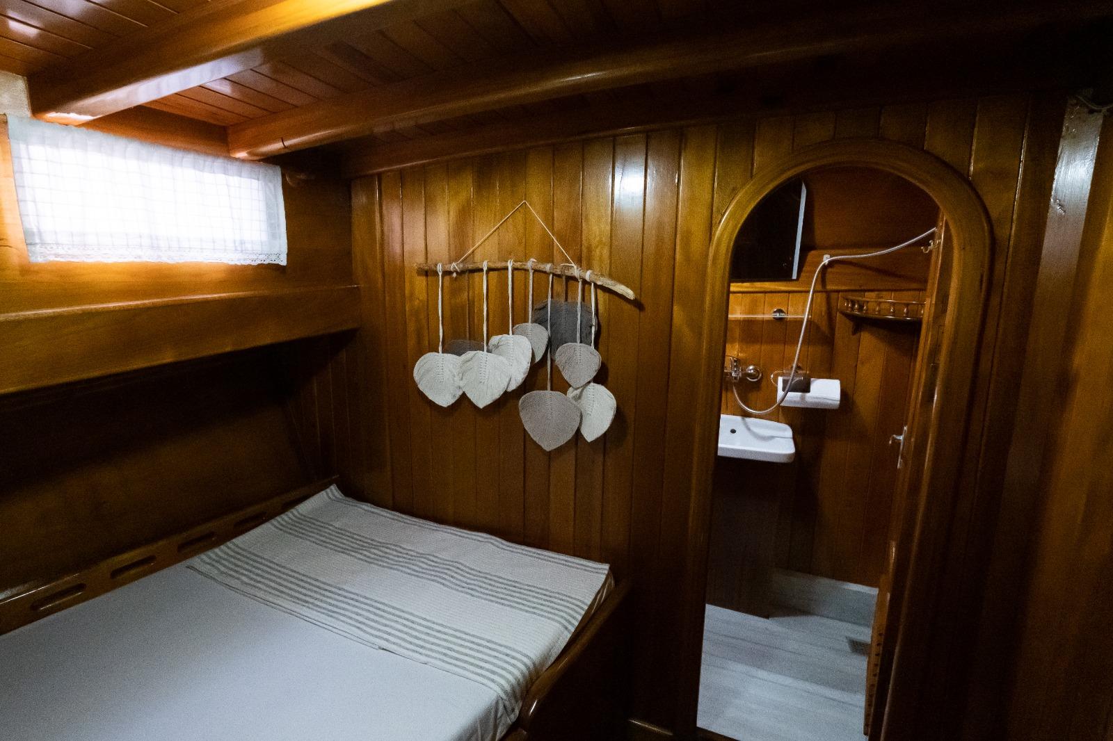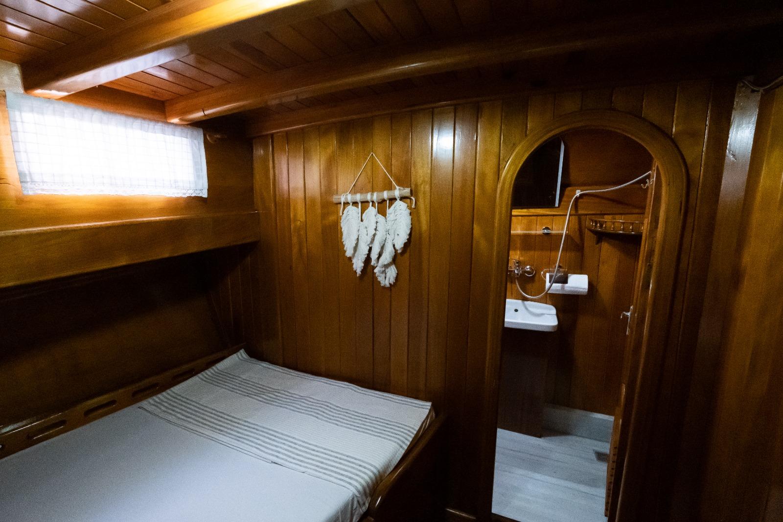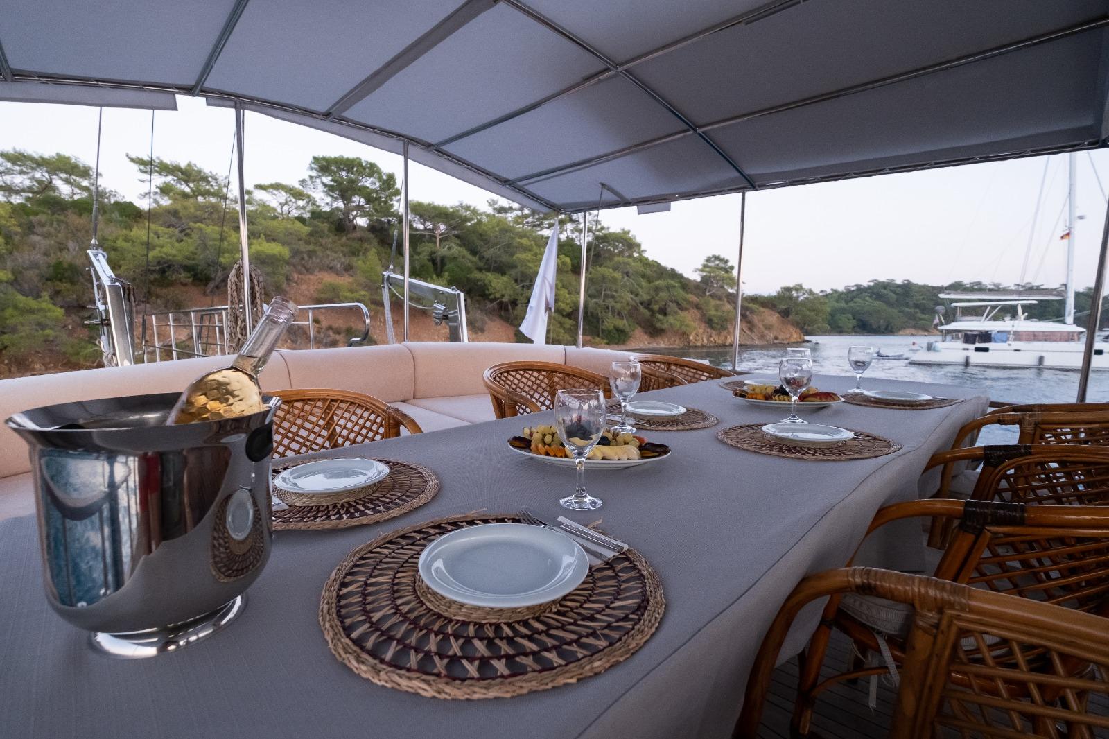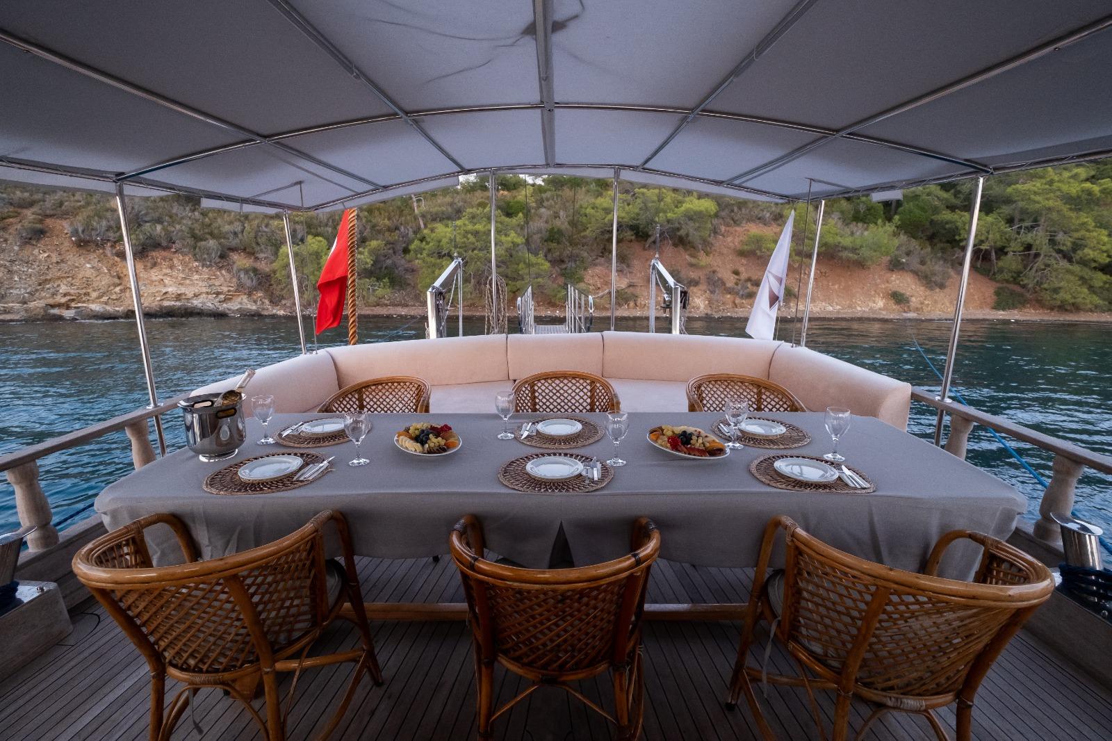 Aft Deck: This is the heart of the yacht. It features a large, shaded dining table where the crew serves fresh, homemade Mediterranean dishes. The comfortable seating area aft is perfect for afternoon naps or sunset cocktails while anchored in one of Göcek’s world-famous bays.