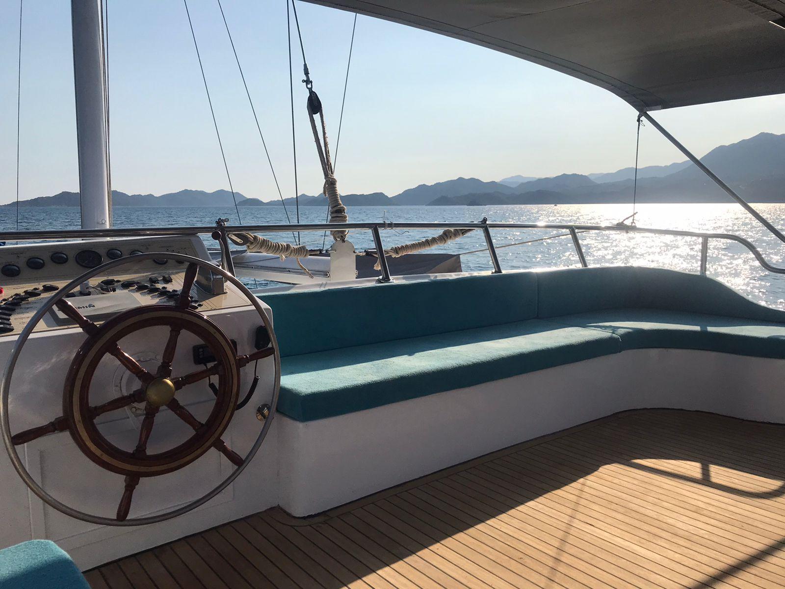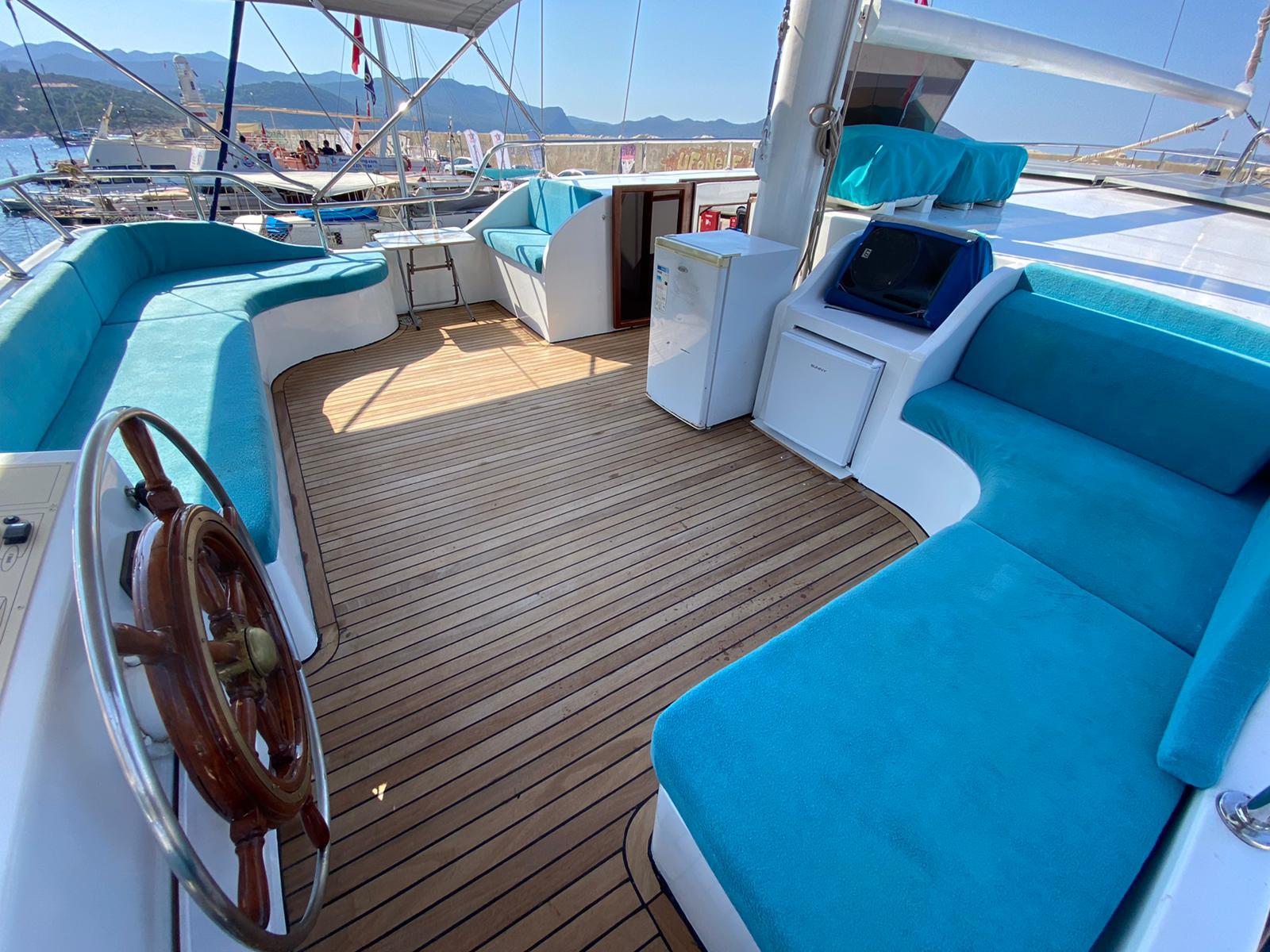 Kıç Güverte: Yatın en popüler kısmıdır. Mürettebatın taze, ev yapımı Akdeniz yemeklerini servis ettiği geniş, gölgeli bir yemek masasına sahiptir. Kıç taraftaki konforlu oturma grubu, öğleden sonra kestirmeleri veya sakin bir koyda demirliyken gün batımı kokteyllerinin tadını çıkarmak için mükemmeldir.