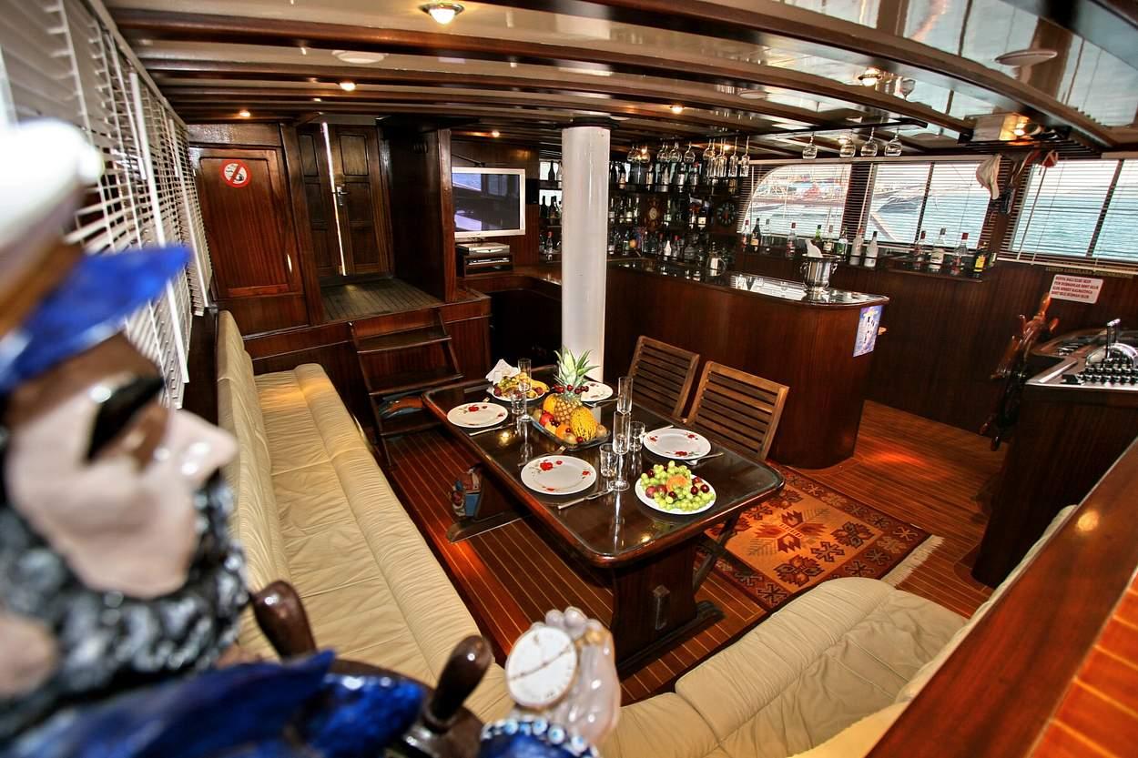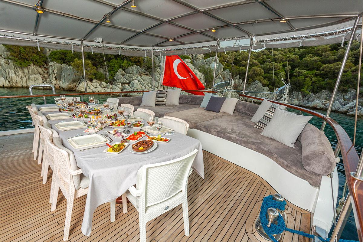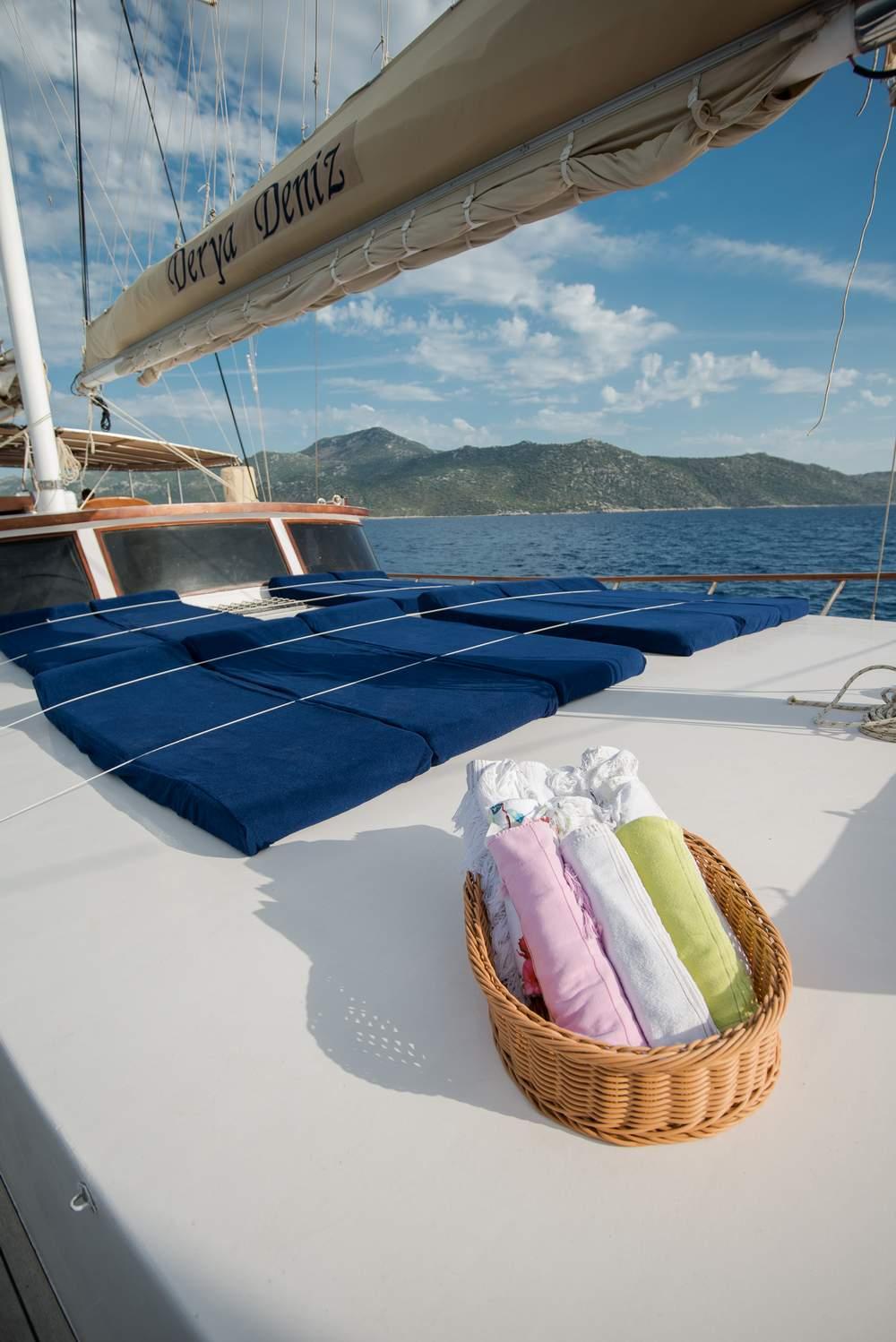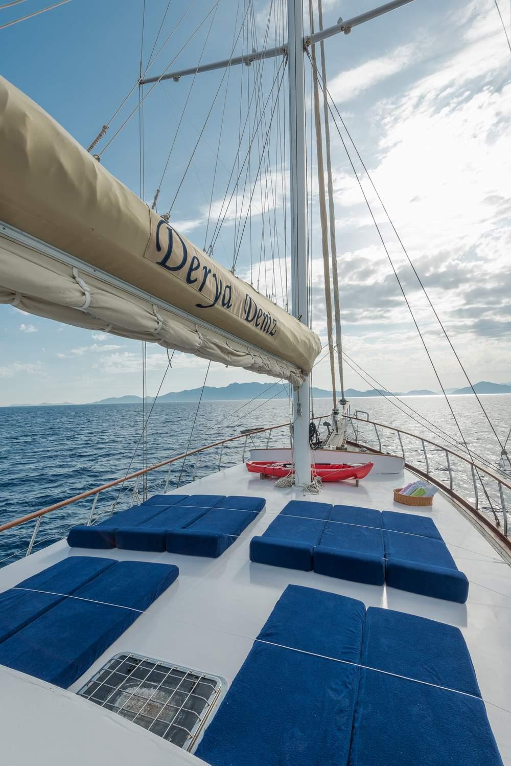 Derya Deniz’deki yaşam, geniş güverte alanları etrafında yoğunlaşır. Kıç güvertede, şef tarafından hazırlanan açık hava gurme yemeklerinin tadını çıkarmak için mükemmel olan büyük, gölgeli bir yemek alanı bulunur. Pruva güvertesi, misafirlerin değişen manzaralara hayranlıkla bakarken kokteyllerin ve sohbetin tadını çıkarabileceği, rahat güneşlenme minderleri ve oturma alanı ile donatılmış dinlenmeye adanmıştır.