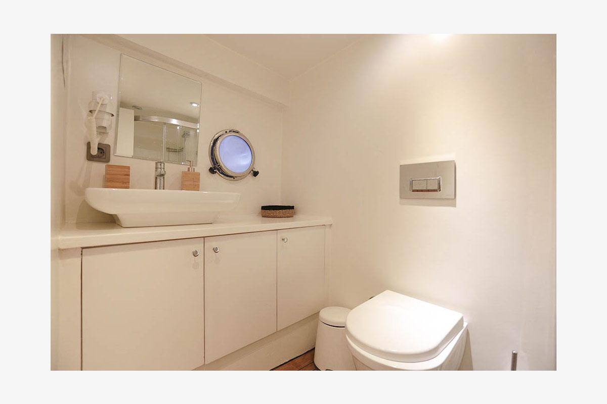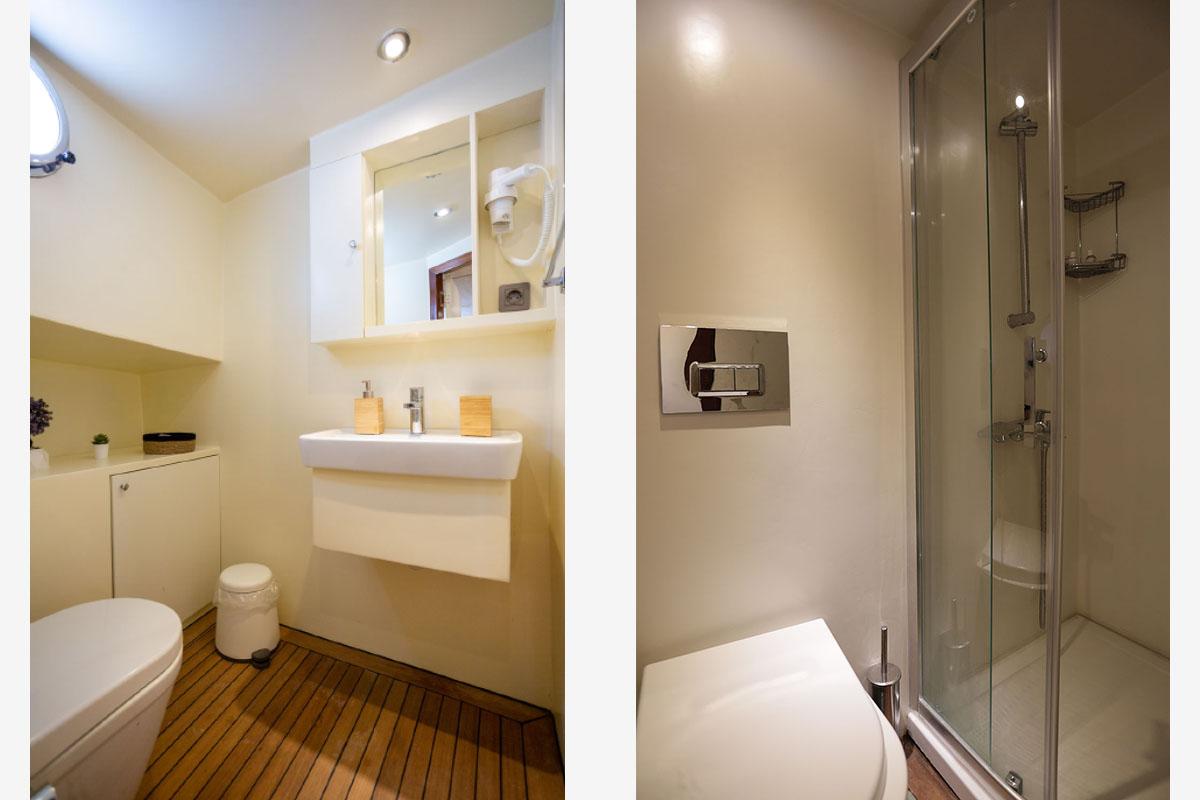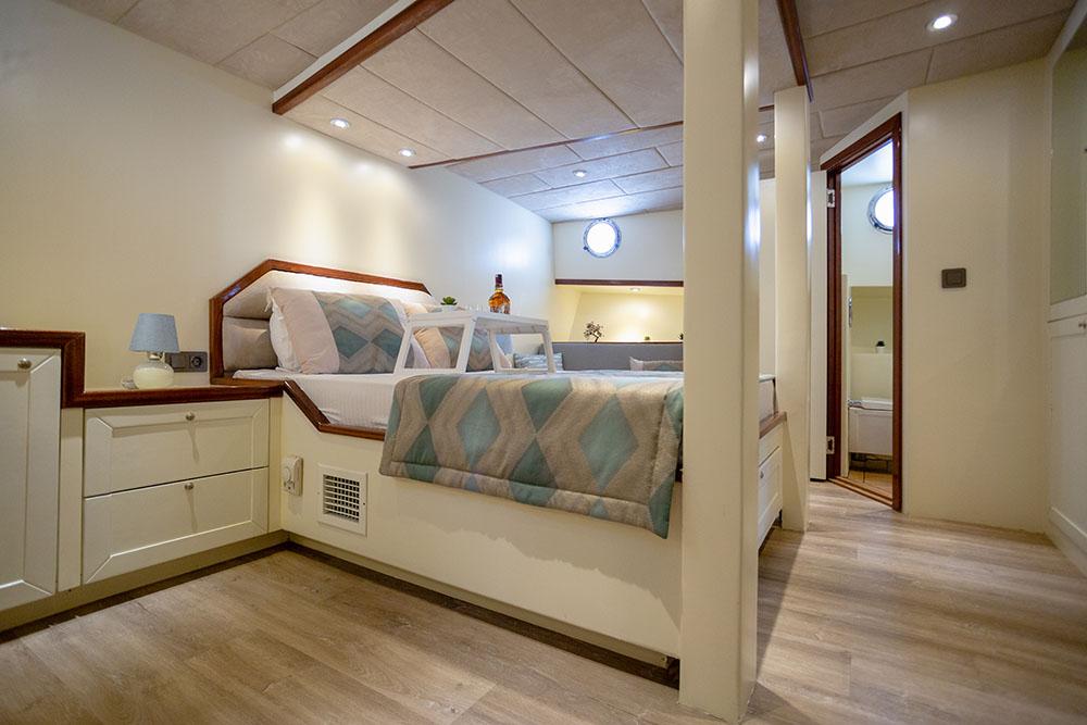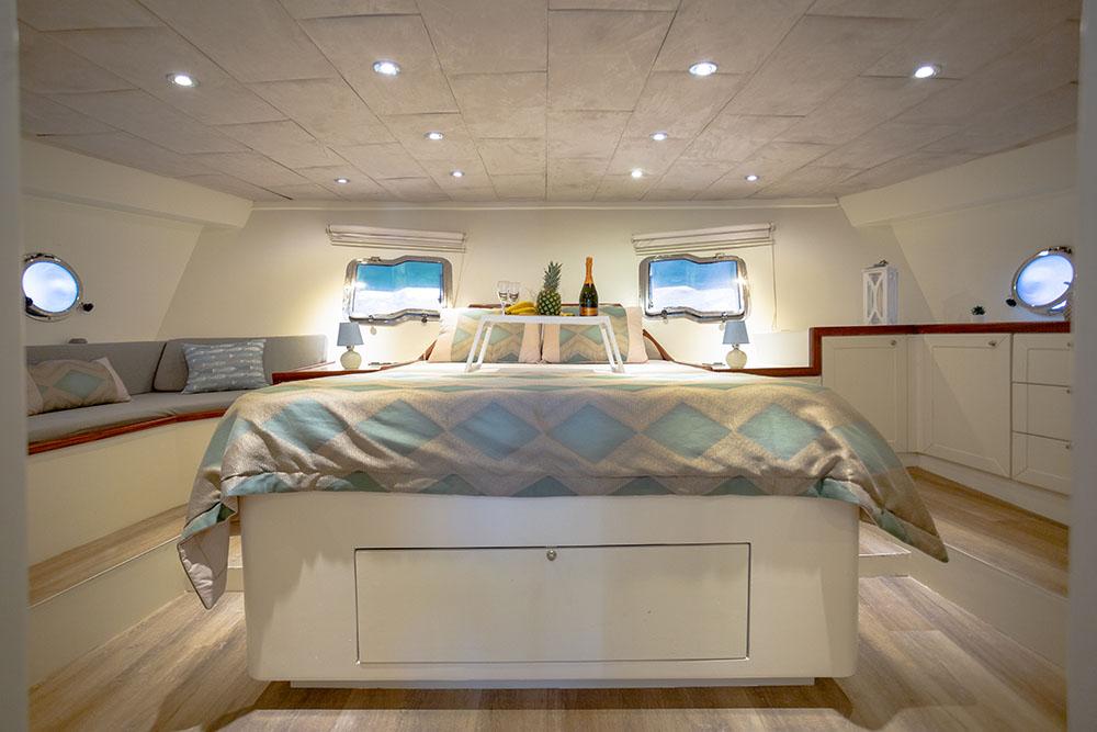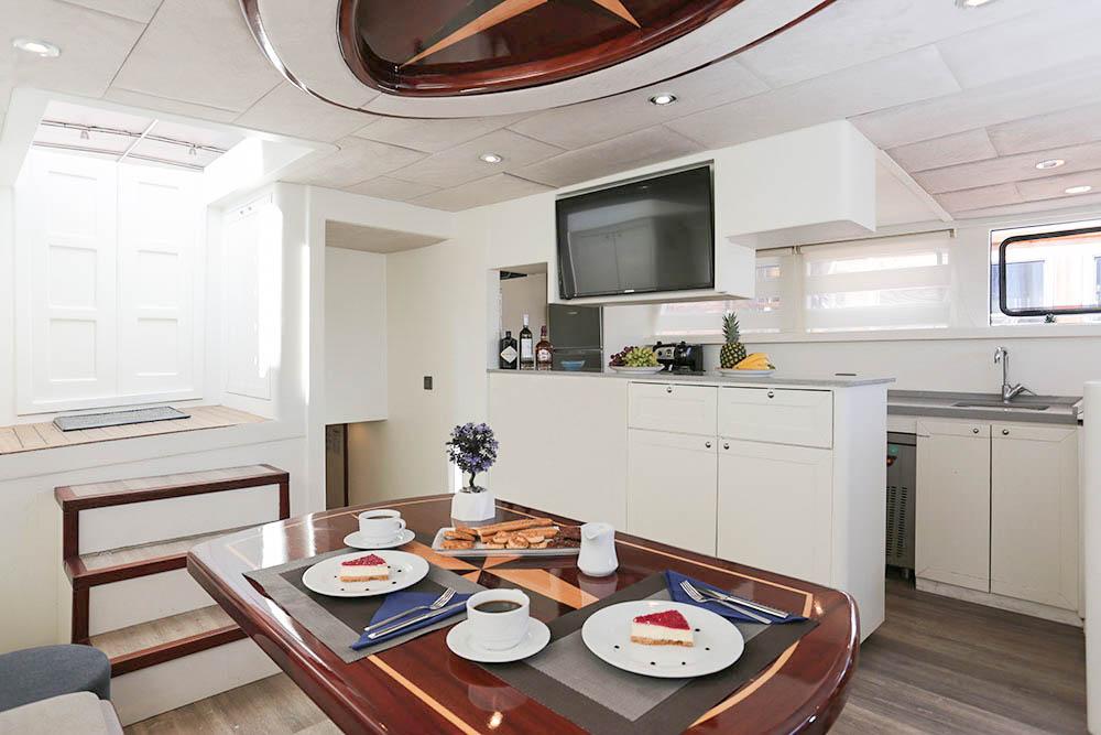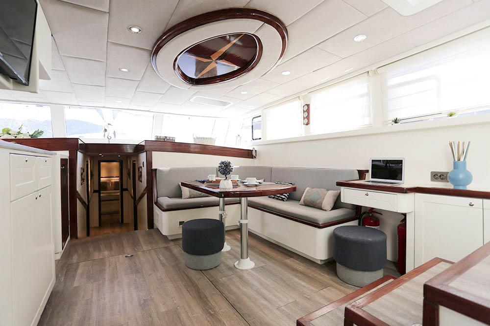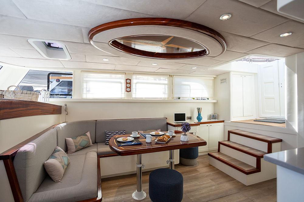 En önemlisi, yat, klima sisteminin verimli ve güvenilir bir şekilde çalışmasına izin veren (gece dahil günlük 6-8 saat) çift 22Kw jeneratörlerle donatılmıştır. Bu yetenek, en sıcak Akdeniz gecelerinde bile serin, sessiz ve konforlu bir gece uykusu sağlayan, üst düzey bir lüks kiralama için temeldir. 2021 yenilemesi sırasında geliştirilen iç tasarım, açık renkli ahşaplar, zevkli mobilyalar ve geniş lumbozlarla donatılmış olup, yaşam alanları boyunca aydınlık ve havadar bir atmosfer yaratır. Misafirler, 220V/24V elektrik, iyi döşenmiş bir salon ve mürettebatı beş yıldızlı mutfak hazırlarken destekleyen tam donanımlı bir mutfak gibi modern kolaylıkları bulacaktır.