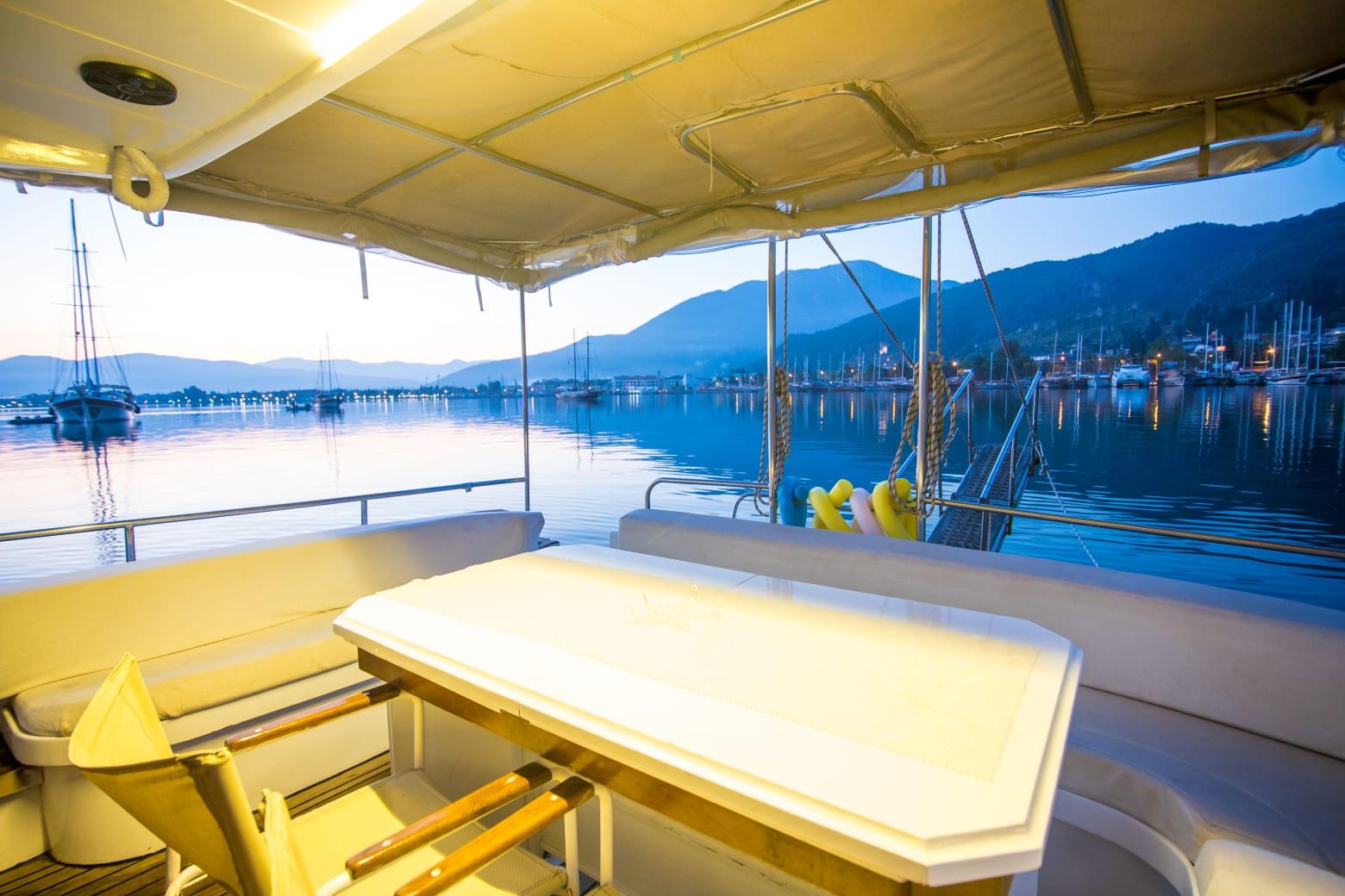 Gölgeli Kıç Yemek Alanı: Yemeklerin tadını çıkarmak ve Akdeniz güneşi altında serin kalmak için mükemmel bir nokta.